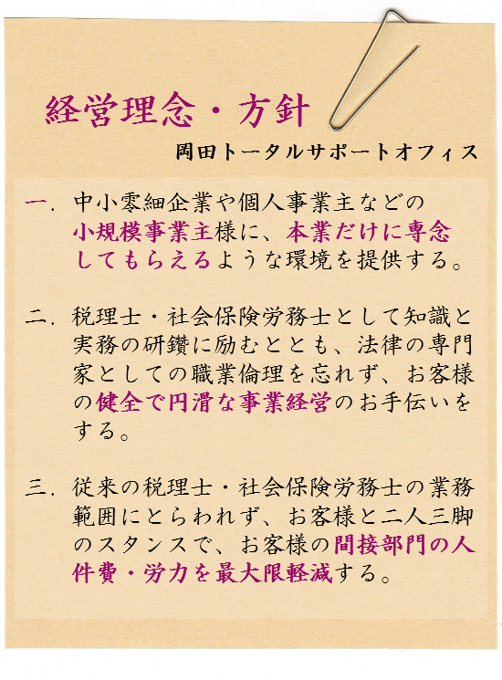 岡田トータルサポートオフィス 税理士会登録名称:岡田昌子税理士事務所 社会保険労務士会登録名称:岡田トータルサポートオフィス |